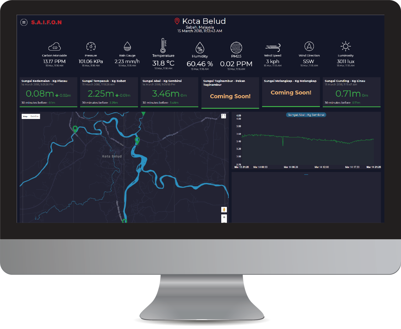 SAIFON is a water level and safety monitoring system that is equipped with a centralised monitoring centre which helps relevant rescue agencies and stakeholders to manage flood relief, rescue and relocation exercises and enhances the decision making process.